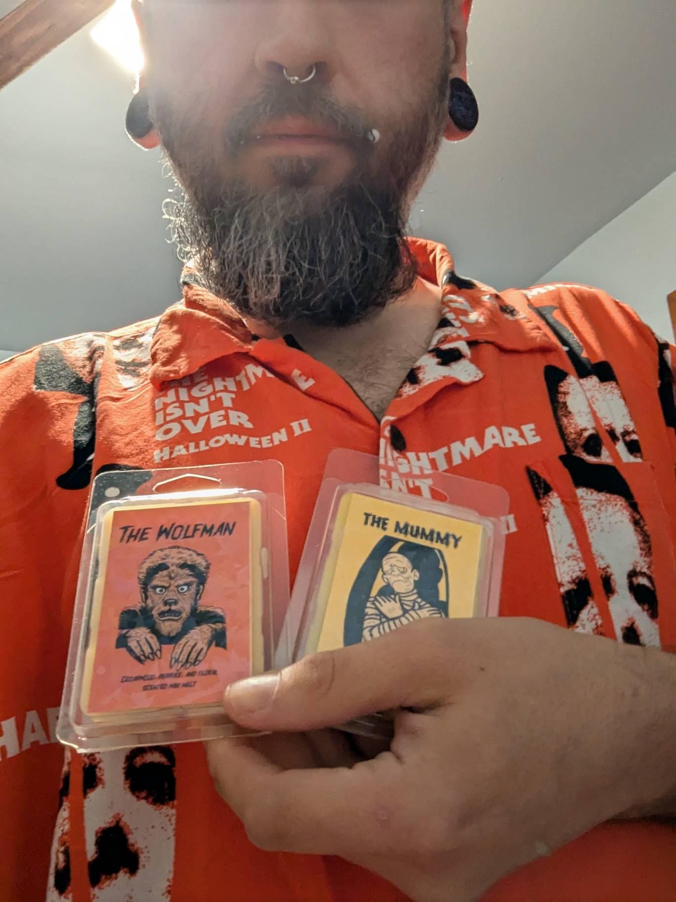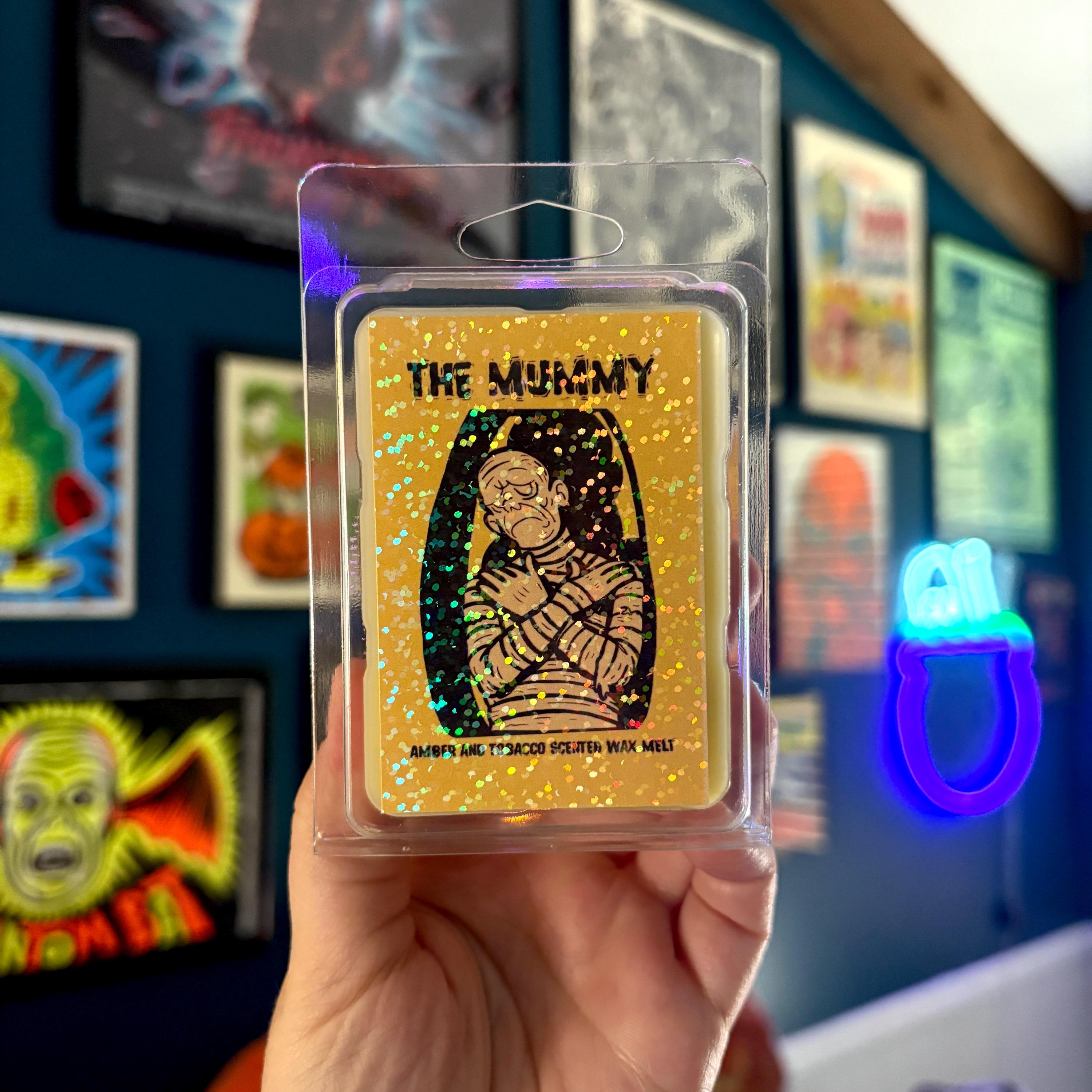 Our Mummy wax melt smells of amber and tobacco. Now with updated art and a holographic finish!