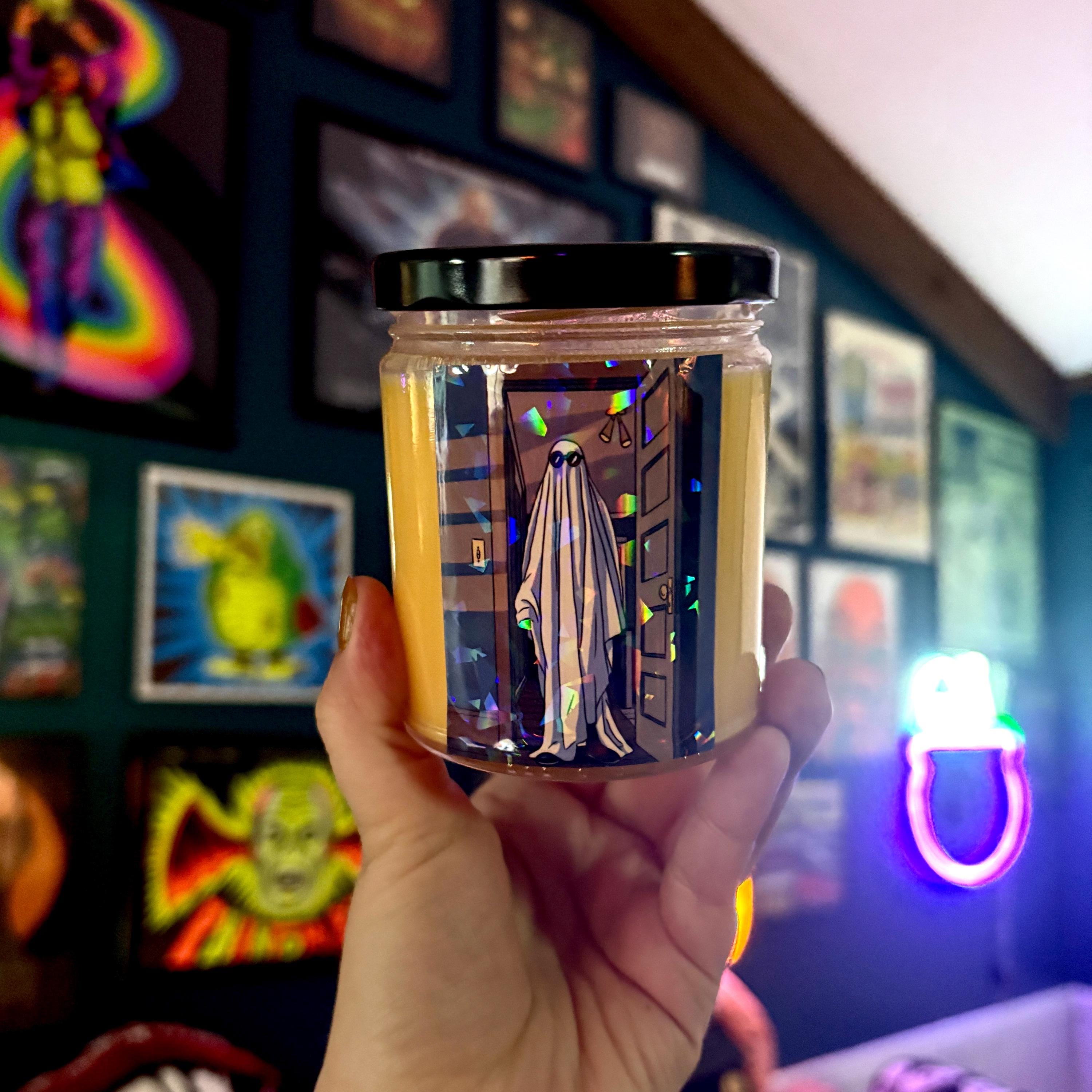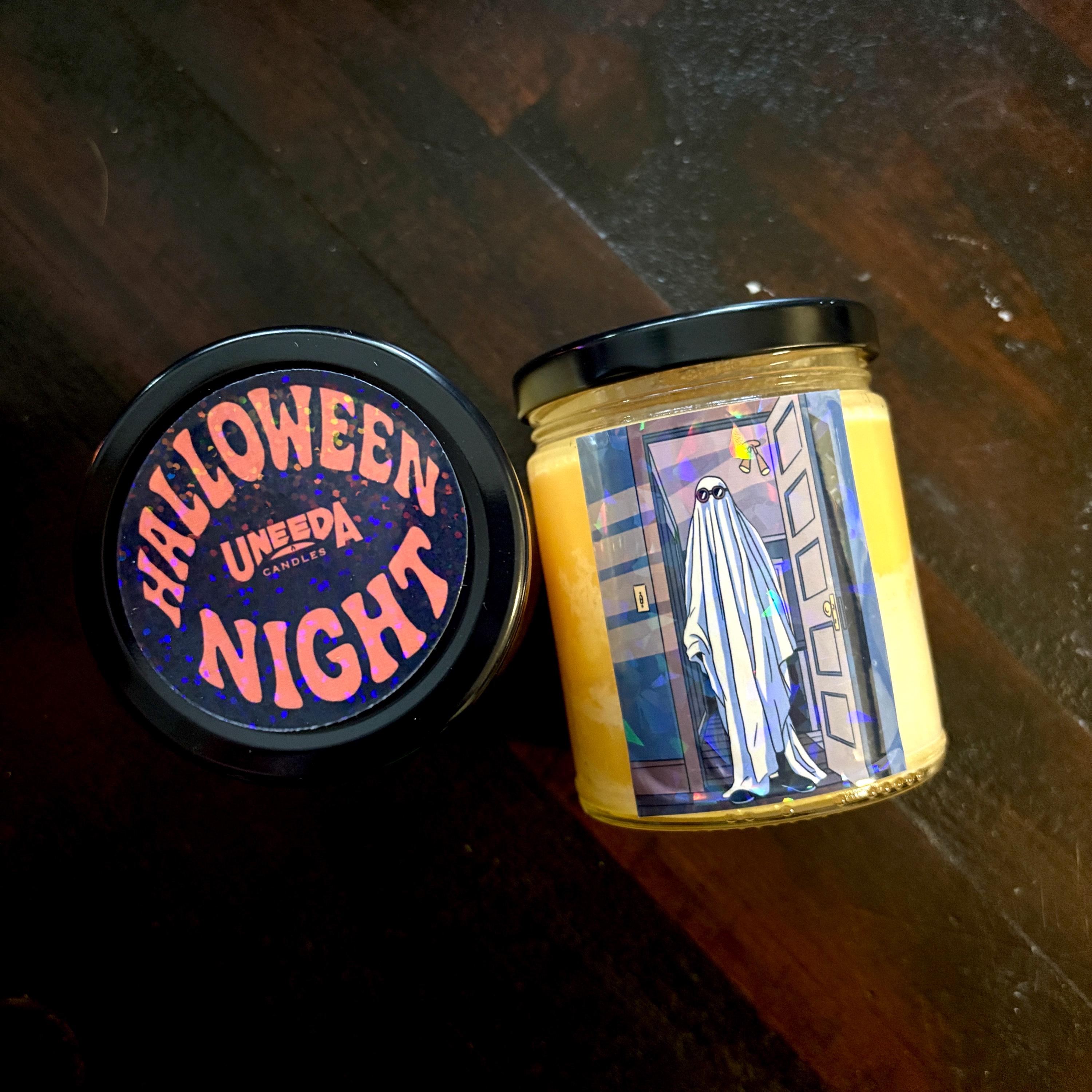 Our Halloween inspired candle smells like a fall night. With notes of cinnamon, citrus, apples, and greenery. Design has a holographic finish and comes in a glass jar with a lid.