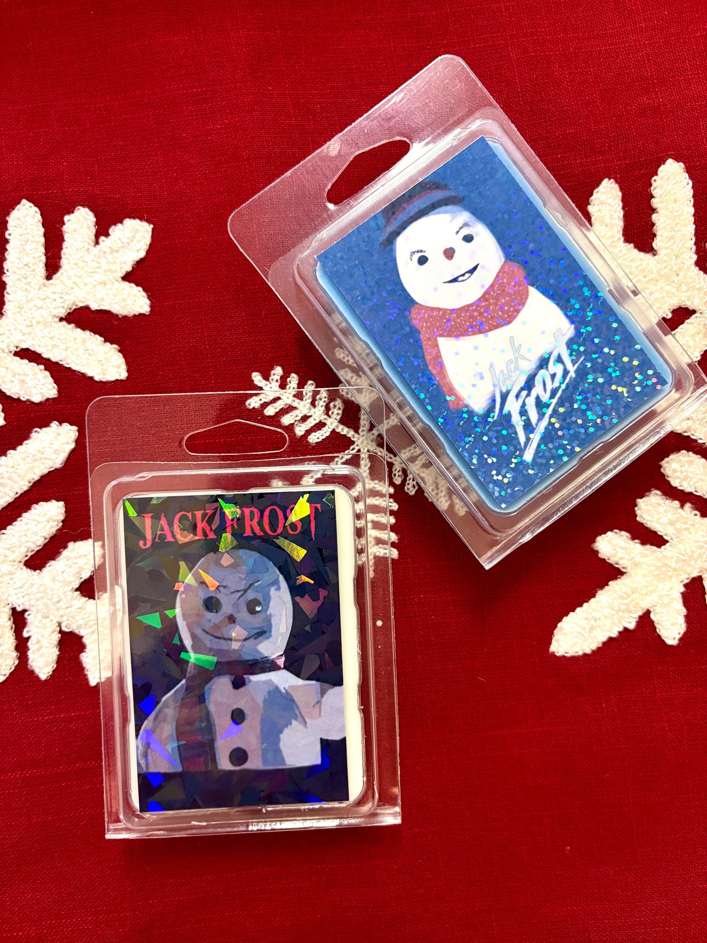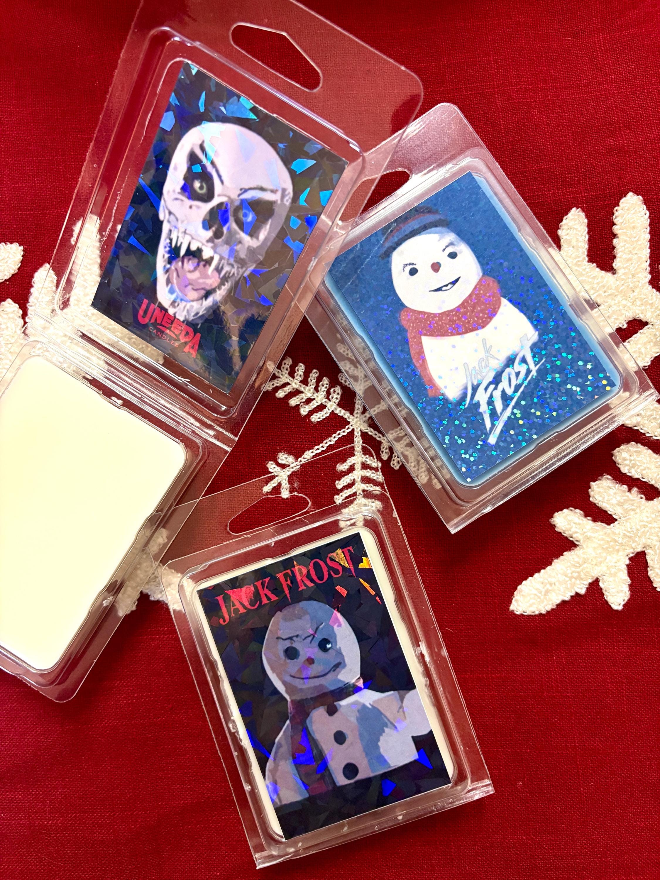 From our holiday collection, our Jack Frost inspired wax melts! This listing is for both melts at a discounted price! Horror Frost smells like ozone, cypress, and hints of sugar. Family Frost smells like cranberry and popcorn garland. Comes with a fun holographic finish.